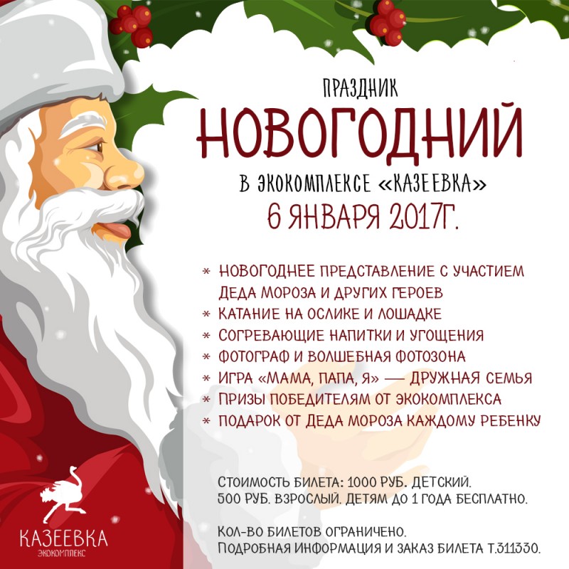 После новогоднего представления мы все вместе сыграем в игру: «Мама, папа, я — дружная семья». Победителей мы торжественно наградим призами от экокомплекса «Казеевка», а самые маленькие гости, независимо от результатов игры, получат подарки от Дедушки Мороза!