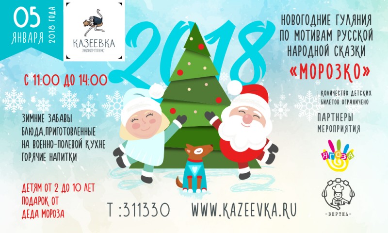 По многочисленным просьбам — празднику быть! 5 января 2018г. 11:00 — 14:00 мы приглашаем в гости на Новогодний семейный праздник в экокомплексе «Казеевка»!
